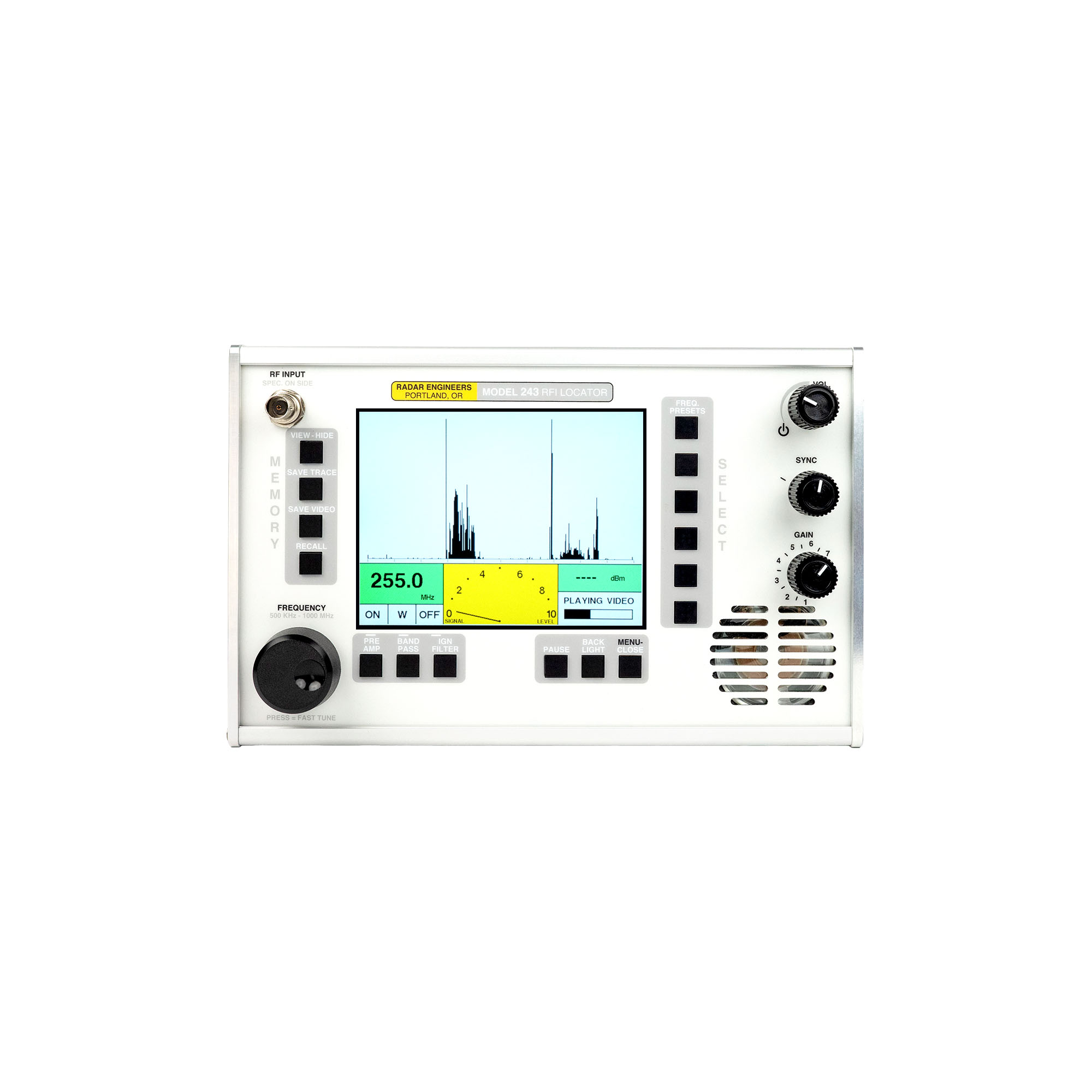 - Frequency: 500 kHz – 1000 MHz Synthesized Tuner
